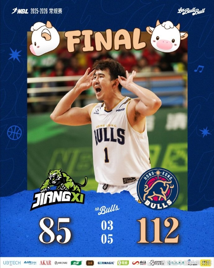 末节决战,球队外线三分火力不减,稳扎稳打牢牢掌控比赛节奏。全场比赛结束,中国香港金牛客场以112-85击败江西裕鲸清酒。